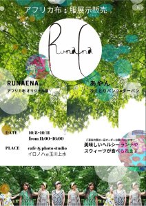 渋谷区神宮前パイユドールにて、7/31までRunaEnaのお洋服&アフリカ布ベビーのフェアを開催中です!